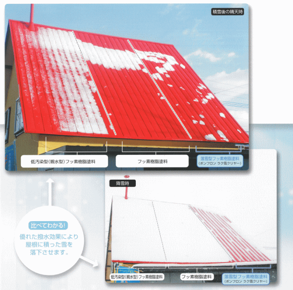 | 高架橋度のフッ素樹脂と特殊な撥水性添加物との相乗効果により雪を落としやすくします。 | ||