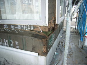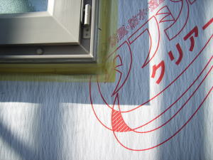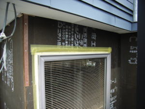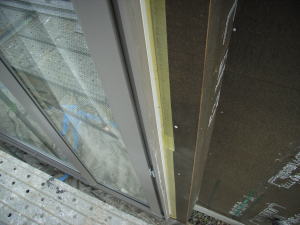 サッシ周りやボードのつなぎ目に、防水テープをこの様に貼ります。